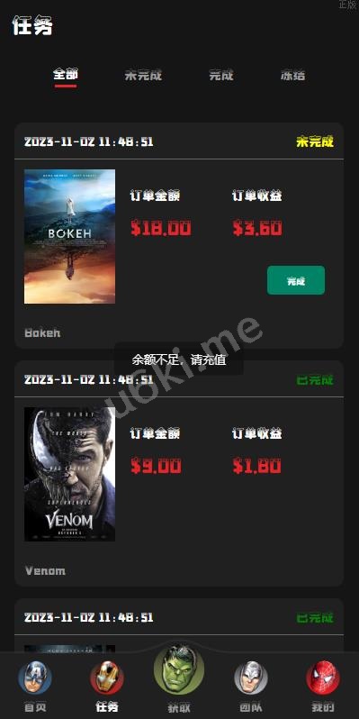 【海外多语言的电影票房刷单】海外漫威电影抢单刷单系统/策略刷单/订单自动匹配 海外多语言漫威电影刷单系统,系统带单独代理后台 可添加用户策略,注册送礼等功能 前端uinapp开发带源码,后端thinkphp框架 海外漫威电影抢单刷单系统 独家推荐 电影刷单