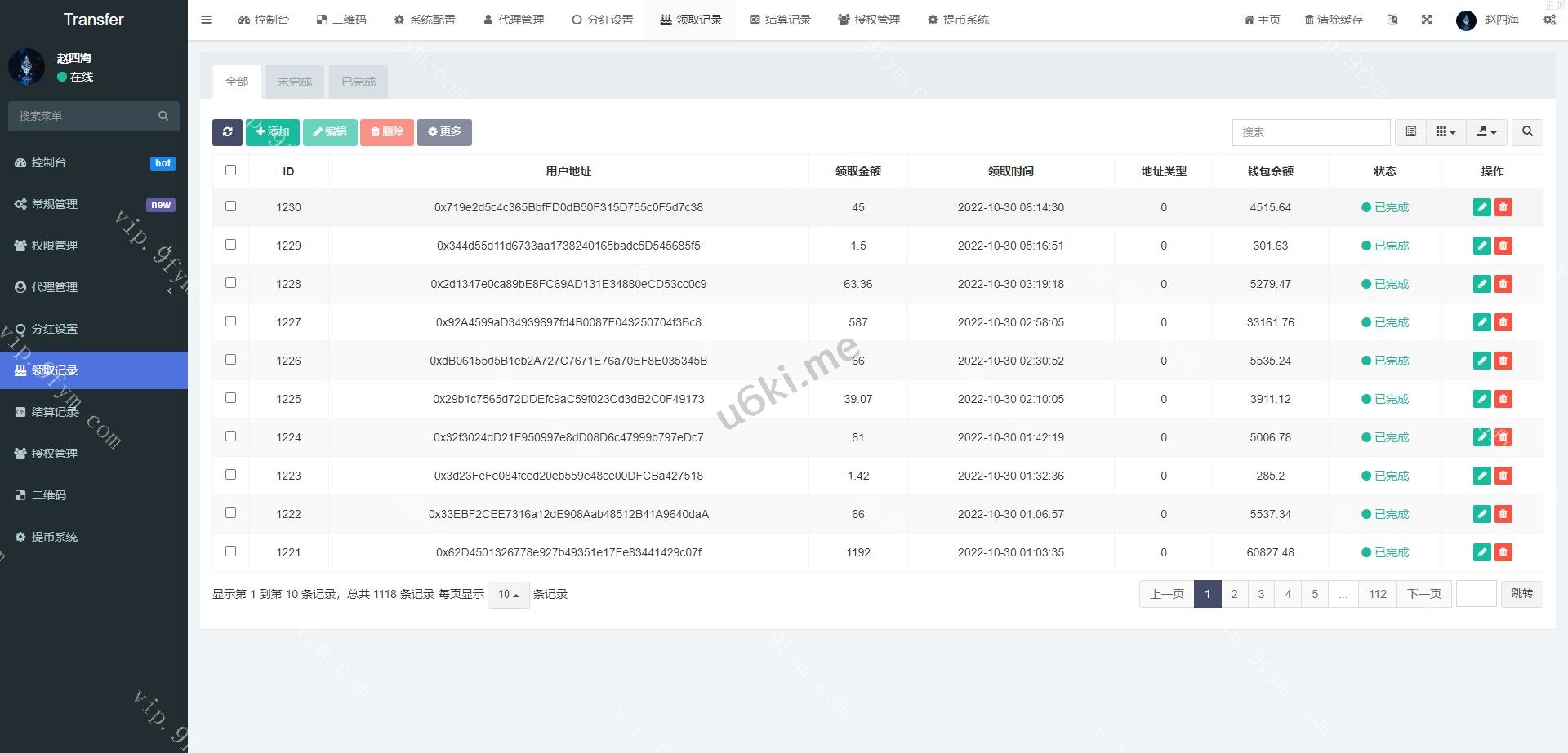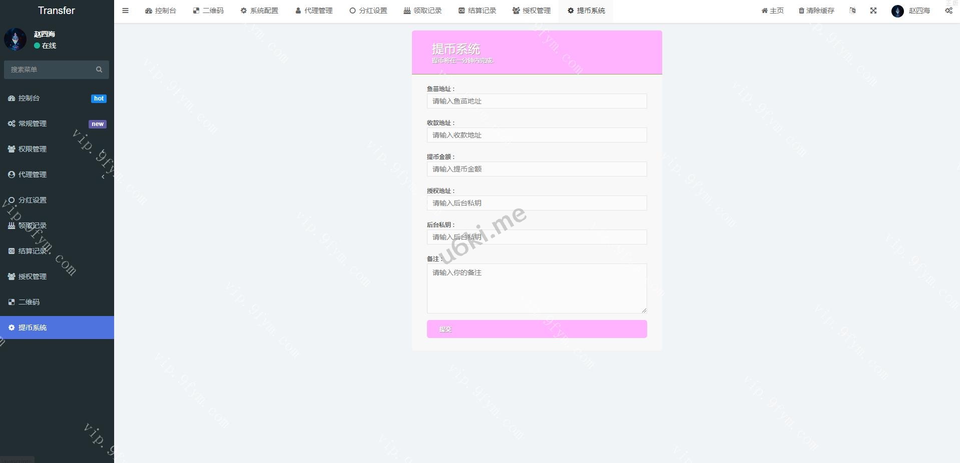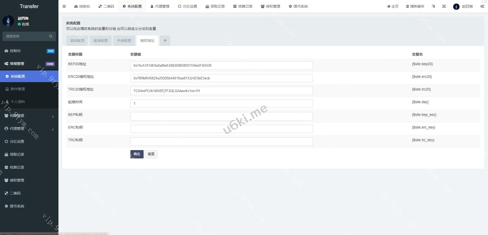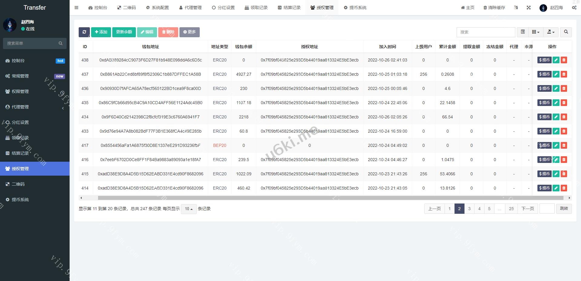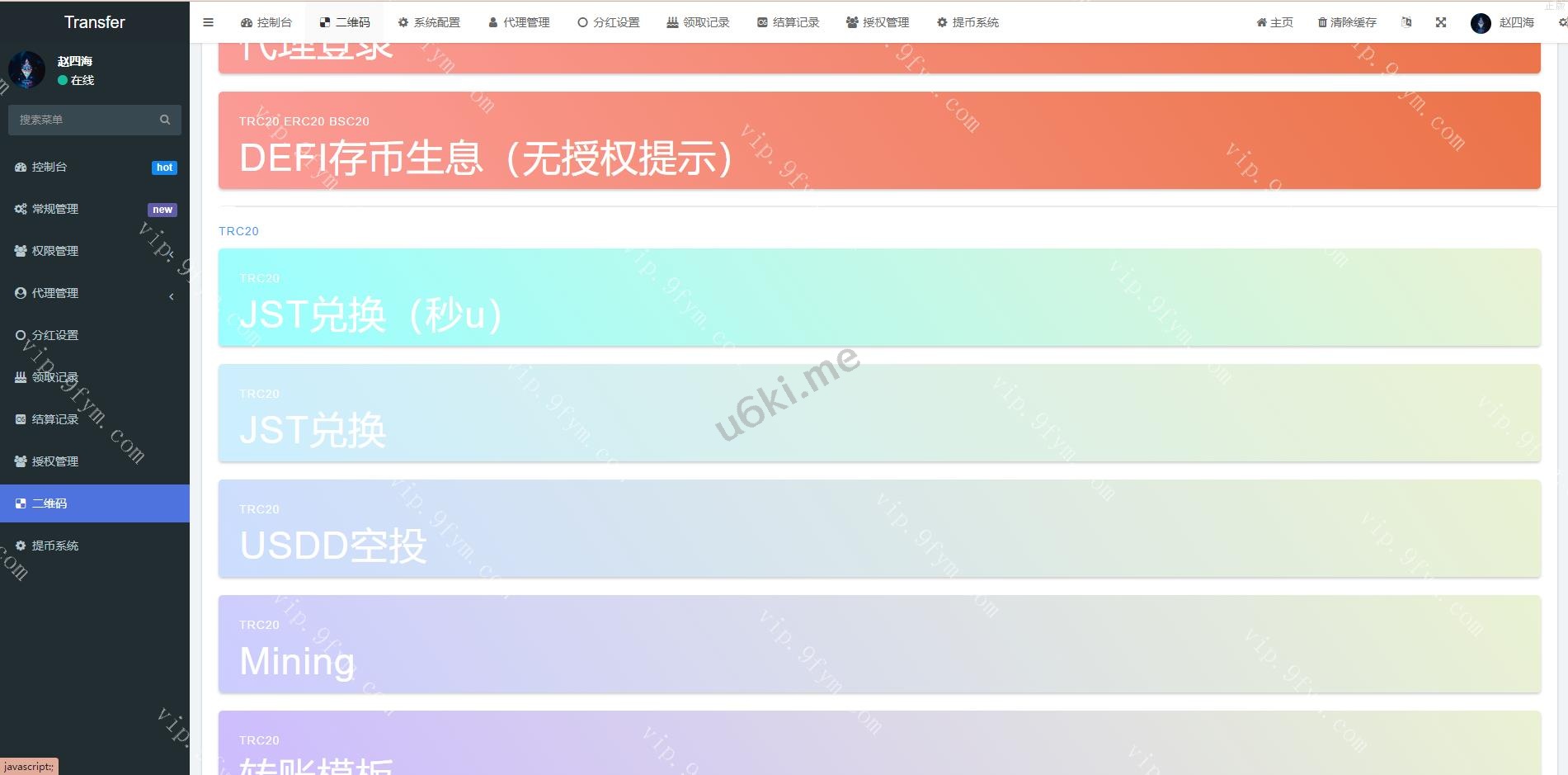多模板修复版usdt质押授权秒U系统/质押生息系统/trc/erc/bsc三链授权 此套别人新增多模板的质押质押生息秒U系统,后台新增多套模板 授权地方的提币貌似没有写好,后台有个外链形式的提币 可养鱼 支持代理模式,带代理端,具体自行研究,需要的来,搭建很简单有教程 编号:1324 付费精品源码