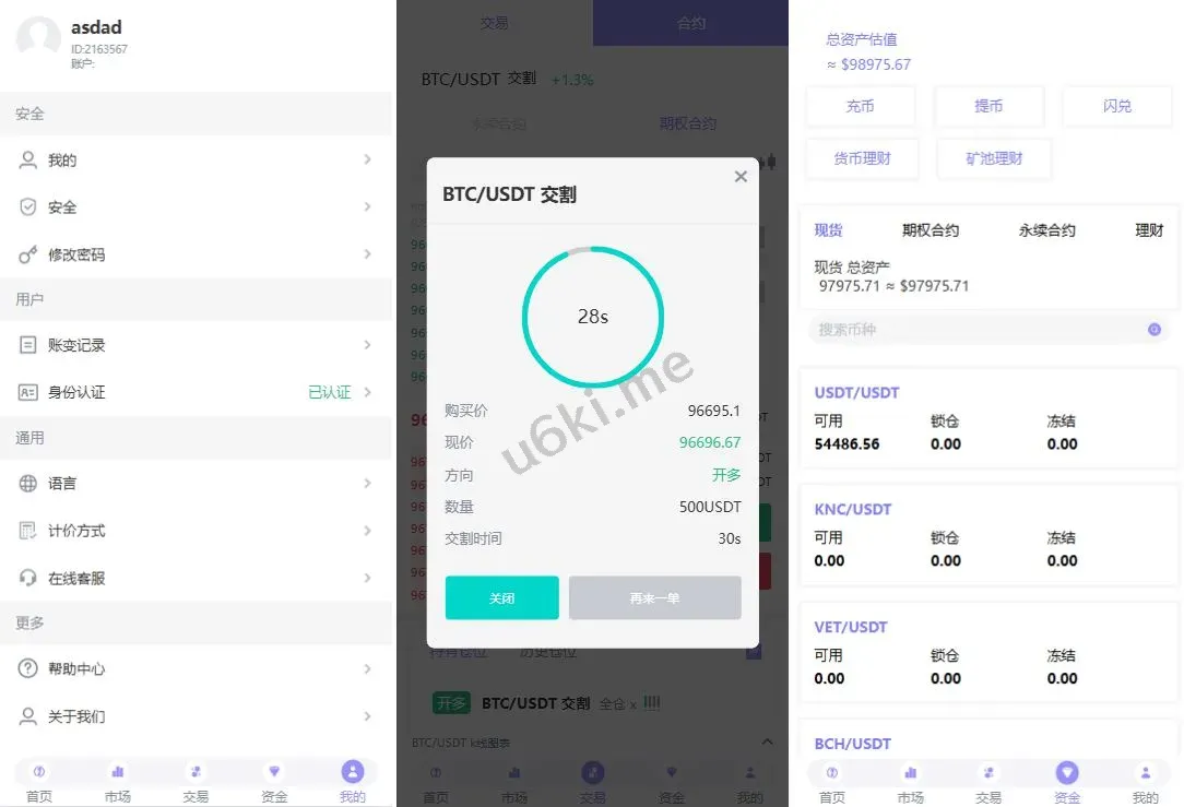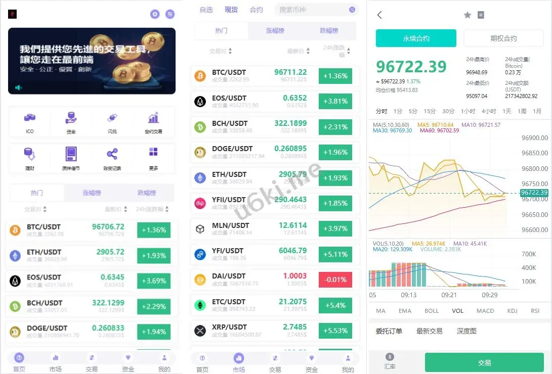系统功能:币币交易、永续合约、期权交易、闪兑、理财、借币、邀请等功能